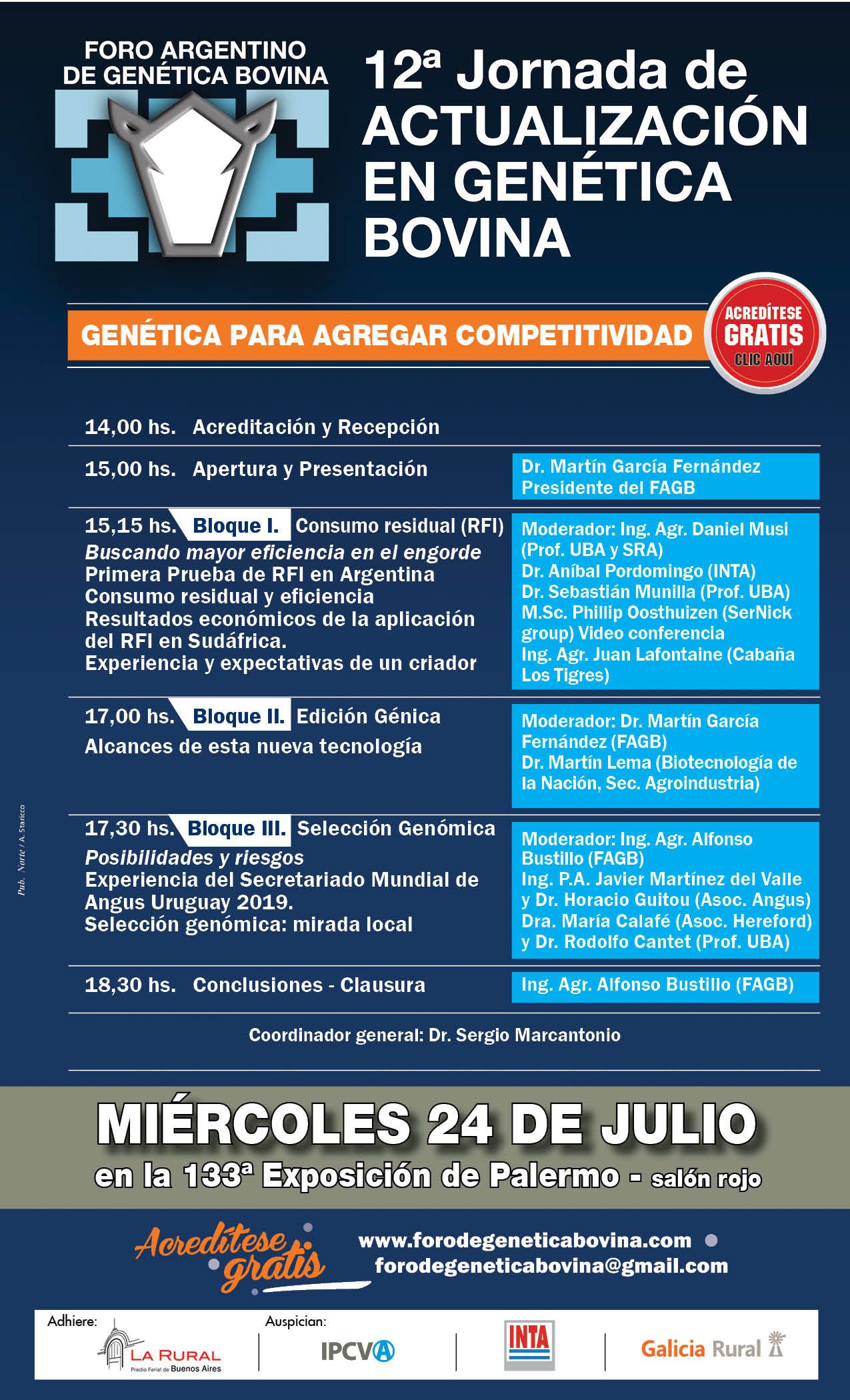 El próximo miércoles 24 de julio, el Foro Argentino de Genética Bovina (FAGB) realizará la 12a Jornada de Actualización en el marco de la 133° Exposición Rural de Palermo.