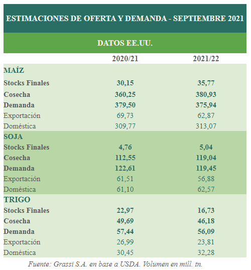 Para el caso de la oleaginosa, los datos más importantes tienen relación con el nuevo ciclo productivo 2021/22 donde la producción la producción de EE.UU. fue elevada a 119,04 millones de toneladas (+0,94 Mtn vs. informe previo), los stocks finales ascendieron a 5,03 Mtn (+0,83 Mtn vs. informe agosto) y los stocks mundiales se serían de 98,89 Mtn, una suba de 2,69 Mtn en relación a los datos del mes pasado.