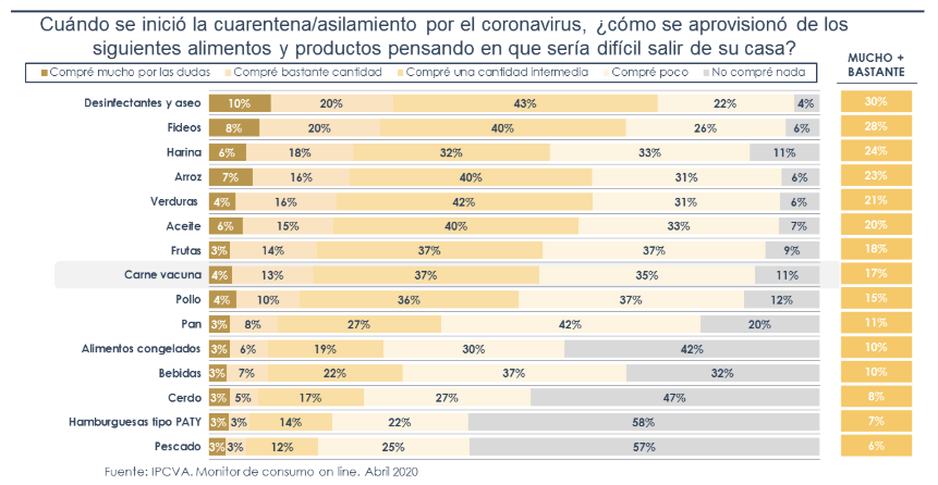 “En el caso de la carne vacuna, un 27 % de la gente manifestó abastecerse en cantidad. Más allá que este valor refleja el valor promedio de toda la población, quizás un dato que llama la atención es que mientras en el segmento de nivel socioeconómico mejor acomodado solo un 13% compró carne en cantidad para encarar su período de cuarentena, en el nivel más bajo, el 31% manifestó abastecerse con abundante cantidad de carne para afrontar el desafío“, señala Bifaretti.