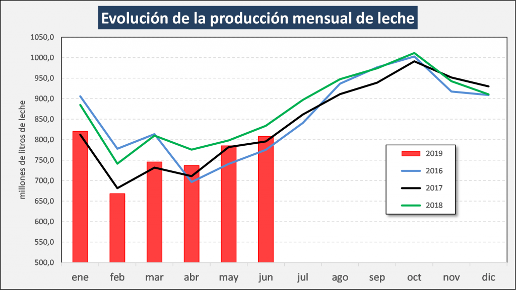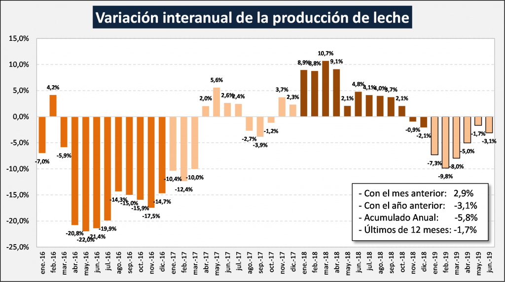 “En el mes de junio de 2019 la producción fue de 807,9, millones de litros de leche, este valor representa una suba del 2,9% respecto al mes anterior (suba del 6,4% si se comparan los promedios diarios) y una caída del 3,1% en comparación con igual mes del año anterior”, informó el Observatorio de la Cadena Láctea Argentina (OCLA).