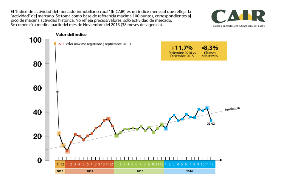 La Cámara Argentina de Inmobiliarias Rurales (CAIR) publicó su Índice (InCAIR) número 38 correspondiente al mes de diciembre del 2016, el cual marcó 33.02 puntos, versus los 43.33  registrados en noviembre, registrando una fuerte caída mensual hacia el cierre del año.
