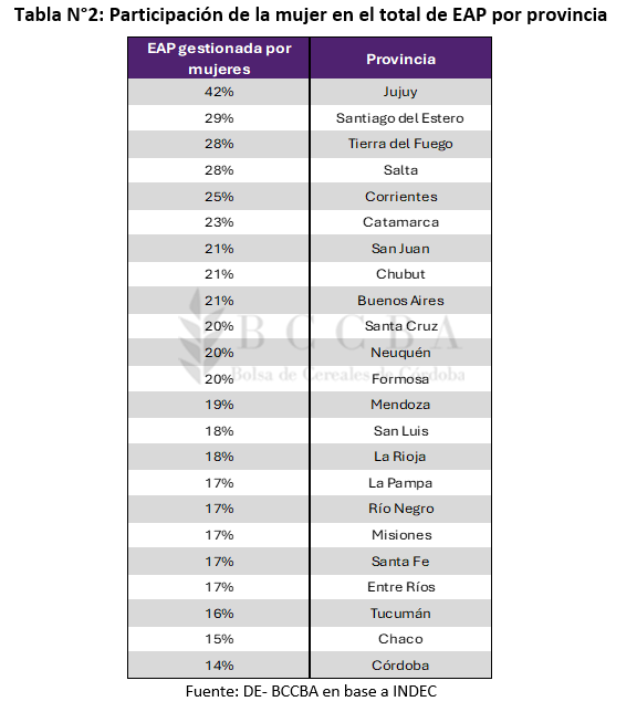 Al analizar por distribución geográfica, la menor desigualdad en el manejo de estos establecimientos se registró en la provincia de Jujuy, donde el 42% está en manos de las mujeres rurales.