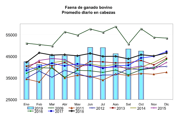 “De acuerdo a datos estimados a partir de información de la Dirección Nacional de Control Comercial Agropecuario (DNCCA), en octubre de 2019 la faena de bovinos superó las 1.3 millones de cabezas (8% más que el mes anterior), aunque la media diaria registró una ligera baja. En los primeros diez meses de 2019 se acumulan 11.5 millones de cabezas, 3% mayor que en igual lapso del año precedente”, informó ABC.