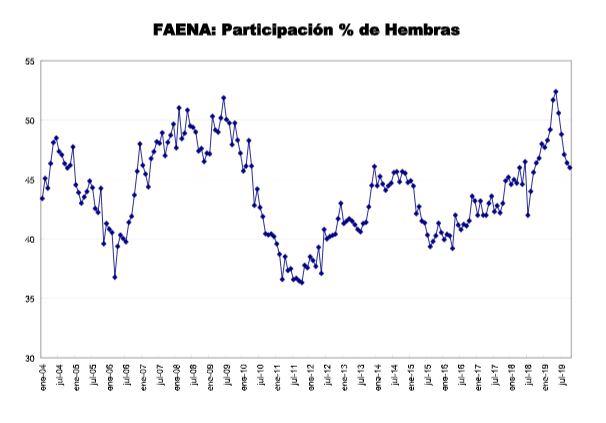 Según el informe la participación de hembras ha vuelto a retroceder. Luego de alcanzar un 52% en mayo, comenzó a descender hasta un 46%. El cambio instrumentado en el sistema de clasificación y tipificación no permite analizar acabadamente su evolución, aunque no deja de ser significativa.