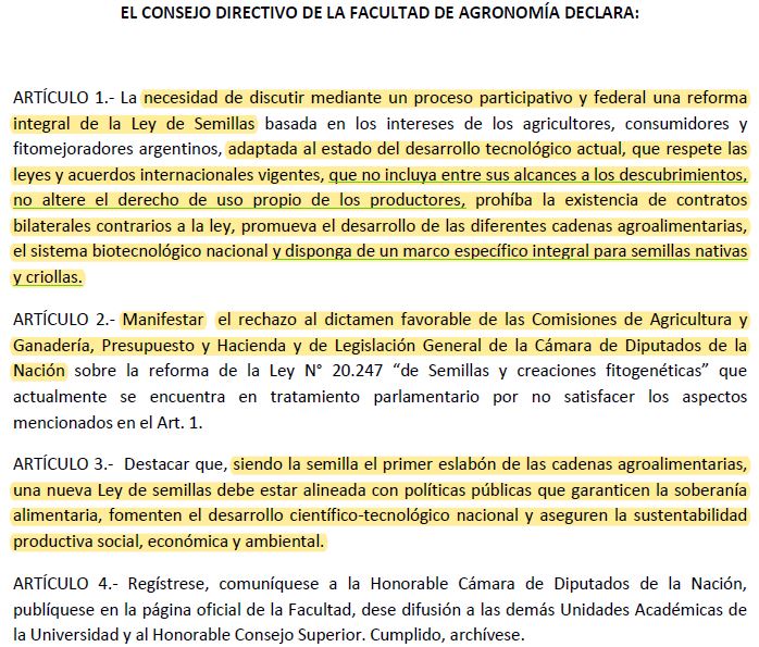 Según la facultad, se necesita una propuesta que “no incluya entre sus alcances a los descubrimientos, no altere el derecho de uso propio de los productores y disponga de un marco específico integral para semillas nativas y criollas“.