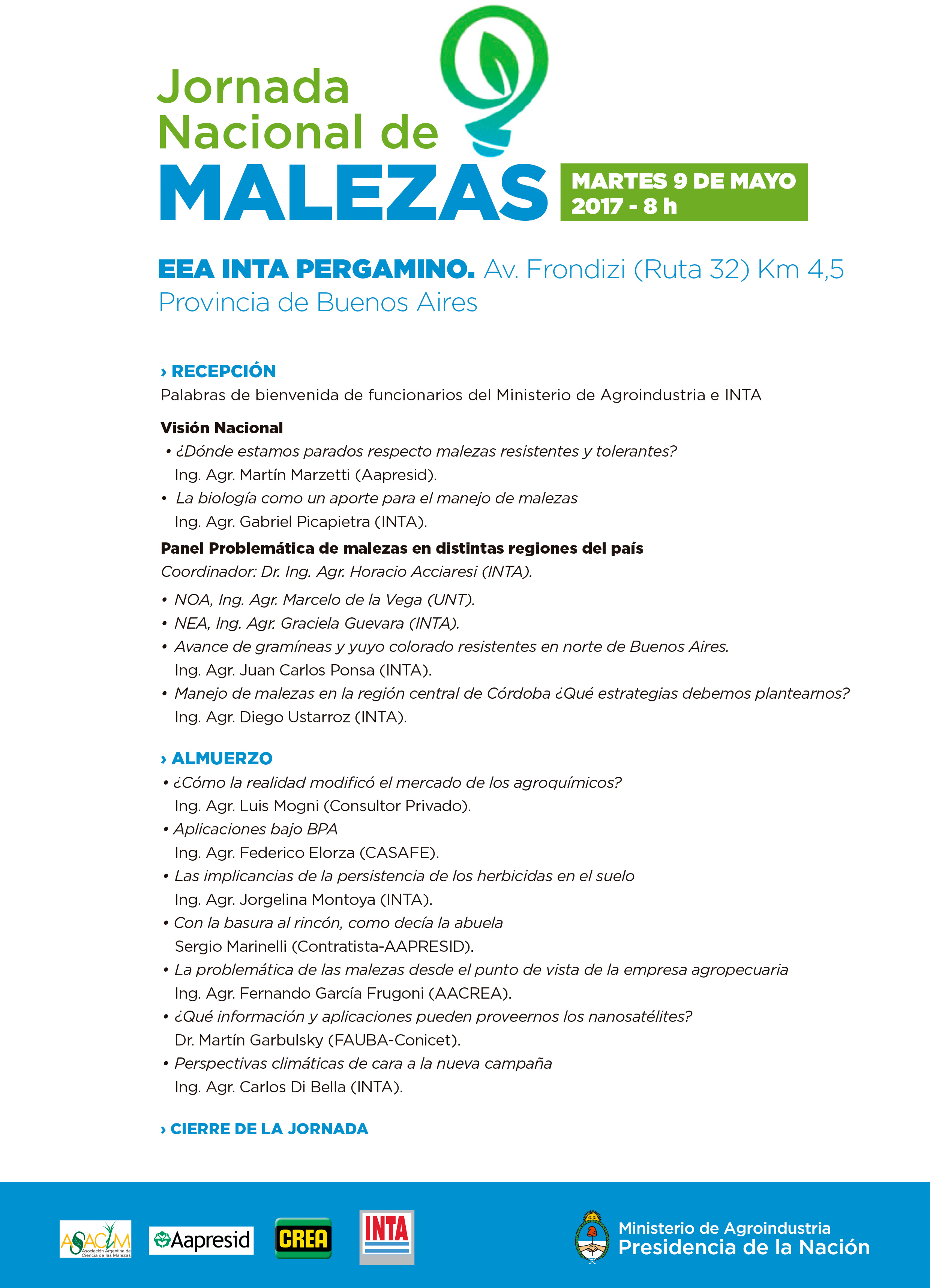 El Ministerio de Agroindustria de la Nación, junto al Instituto Nacional de Tecnología Agropecuaria (INTA), invita a los productores, estudiantes, empresas, técnicos y público interesado a una nueva edición de la Jornada Nacional de Malezas que se realizará en la Estación Experimental Agropecuaria INTA Pergamino, Av. Frondizi (ruta 32) km 4,5 de esa localidad, a partir de las 8 de la mañana.