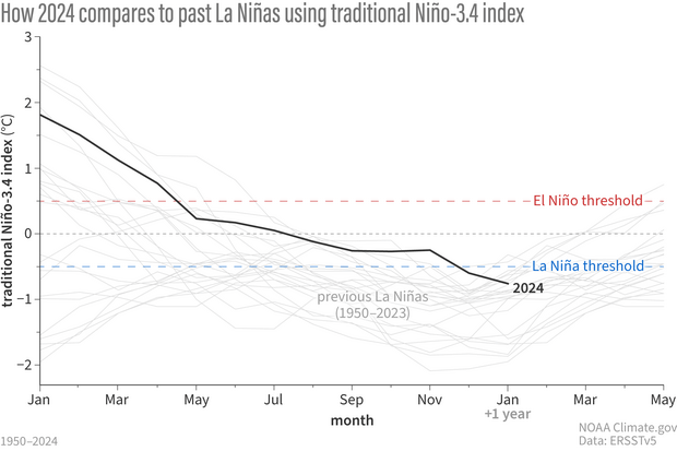 Cómo cambiaron las temperaturas de la superficie del mar en la región de El Niño-3.4 del Pacífico tropical a lo largo de todos los eventos de La Niña desde 1950 (líneas grises) y 2024-25 (línea negra). Esto muestra el cálculo tradicional para El Niño-3.4, la temperatura mensual comparada con el promedio de 30 años más reciente (1991-2020 para la línea de 2024). Según esta medida, el umbral de La Niña se cruzó en diciembre de 2024, pero La Niña sigue siendo débil. Gráfico de Climate.gov, basado en datos de Michelle L’Heureux de CPC utilizando ERSSTv5 .