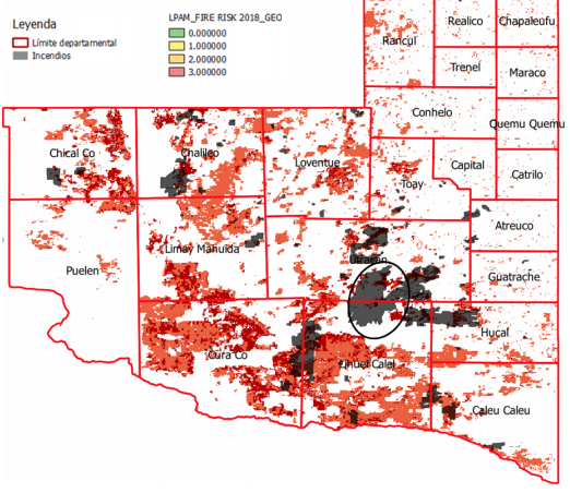 Entre el 24/01 y el 30/01/2018 el área afectada se incrementó en 171000 hectáreas (39%), esto se debe a la activación de un foco en el sur del departamento de Utracán, que se extendió hasta Lihuel Calel afectando 154000 hectáreas. El área afectada por el fuego (gris) coincide con la pronosticada como de alto riesgo en mayo de 2017. Si bien se originó en áreas señaladas como de alto riesgo, el viento hizo avanzar las llamas hacia zonas de menor peligro, pero no por eso con menor capacidad de combustión