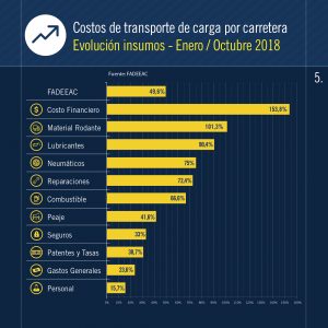 En el transcurso de 2018 lideran los aumentos de costos el Costo Financiero (153.8%), Material Rodante (101.3%), Lubricantes (90.4%), Neumáticos (75%), Reparaciones (72.4%) y Combustibles (66.6%), en tanto que en el incremento desagregado en 2017 lideraron los aumentos de costos Peaje (42.2%), en el marco