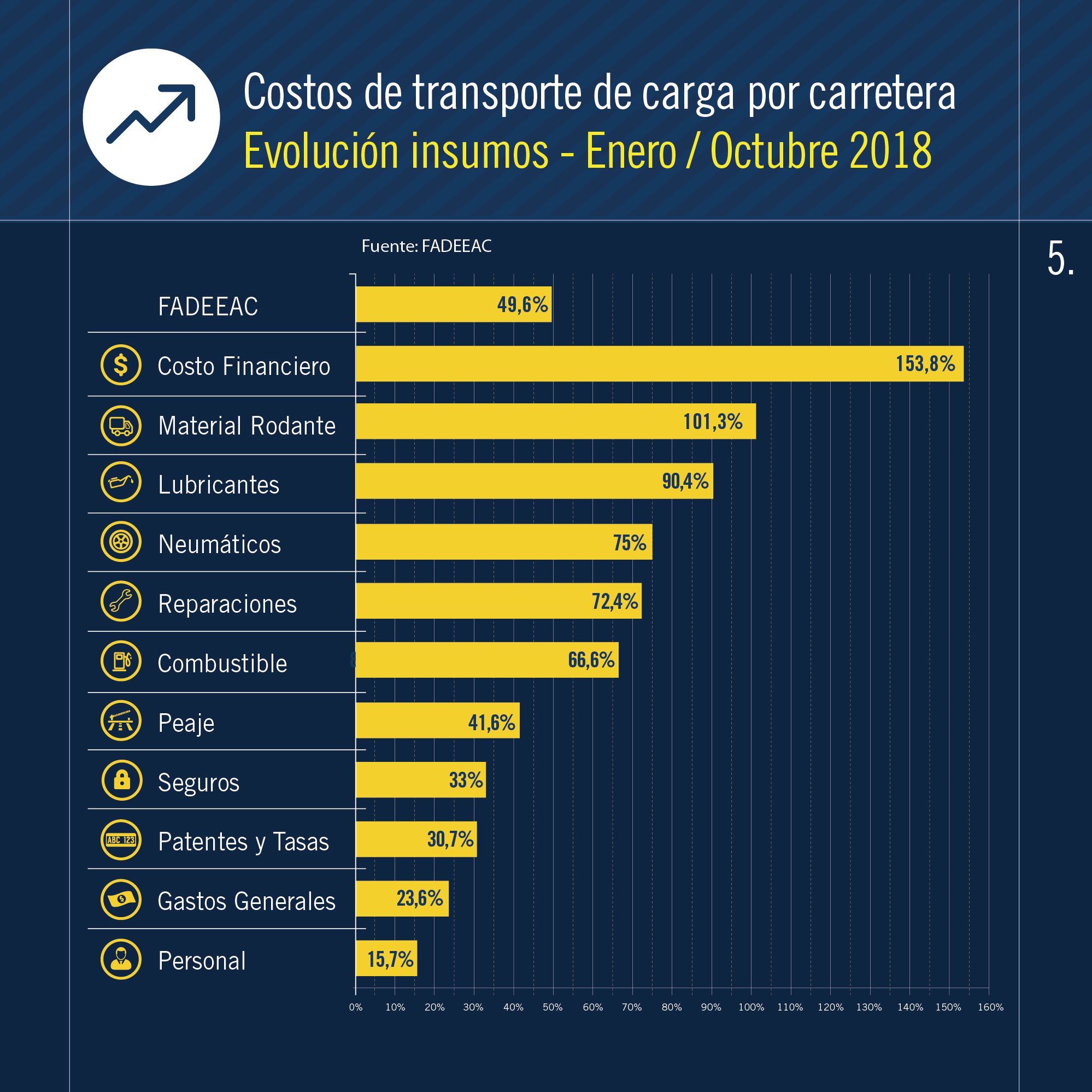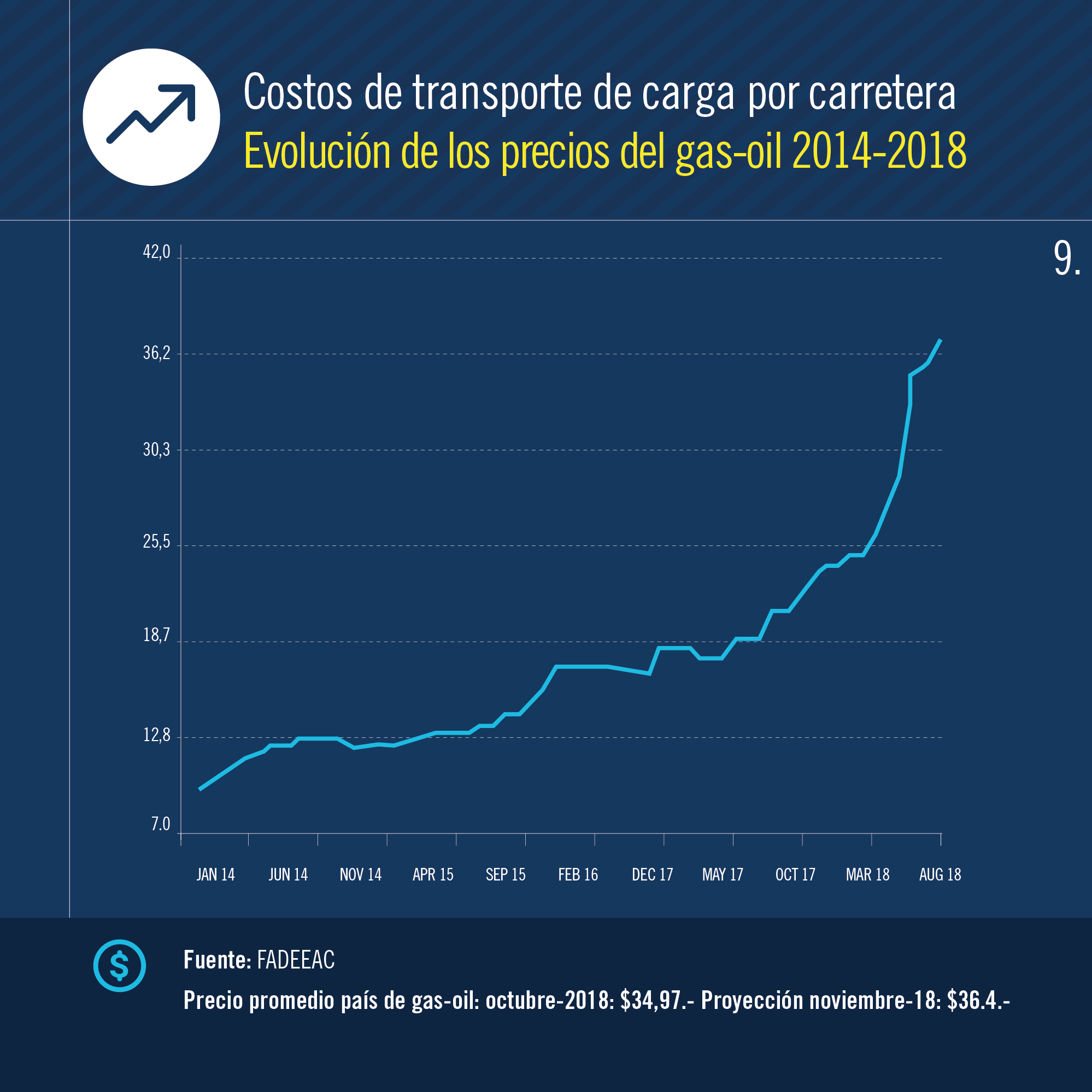 Si se proyecta el nuevo aumento de los combustibles y el 11% de suba en los salarios para noviembre, se registraría un aumento no menor del 57% de enero-noviembre de 2018. En estos términos, el 2018 será el año de mayor variación de costos desde 2002. Durante este año se registra una fuerte caída de la actividad económica, y, en consecuencia, de los volúmenes transportados, en un contexto económico ya abiertamente recesivo.