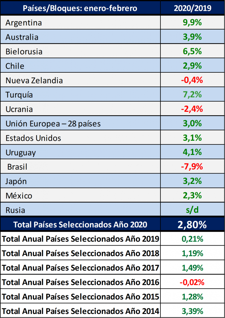 “Entre los principales países productores e importadores que representan alrededor del 60% de la producción mundial de leche de vaca, en el cual se puede observar un importante incremento de la producción del 2,8% (total), para el 1° bimestre del 2020 respecto a igual período de 2019“, informó el OCLA.