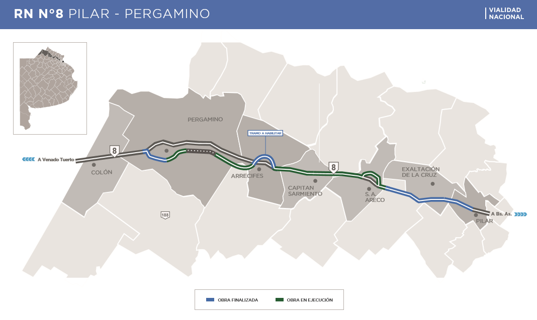 La nueva vía segura forma parte de la Autopista Pilar-Pergamino, la obra vial de mayor extensión ejecutada en simultáneo por un gobierno nacional en Argentina. Abarca más de 160 km de la ruta 8 en el norte de Buenos Aires y beneficiará a más de 33.000 usuarios por día.
