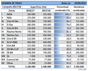 “A pesar de haberse registrado precipitaciones sobre las regiones de Buenos Aires, La Pampa, sur de Córdoba y sur de Santa Fe, la siembra del cereal avanzó durante la última semana 11,8 puntos porcentuales a nivel nacional, impulsada principalmente por las buenas condiciones climáticas en el NOA, NEA y norte de Santa Fe. De esta manera, el progreso nacional de siembra alcanzó el 64,7 % de las 5.500.000 hectáreas proyectadas para el presente ciclo, cifra que de concretarse hacia el final de la campaña reflejaría un incremento interanual del 7,8 % (Superficie Trigo 2016/17: 5,1 MHas). En cuanto al crecimiento y desarrollo de los lotes implantados, los mismos continúan transitando etapas desde emergencia hasta macollaje bajo adecuadas condiciones de humedad y sanidad”, indicó la Bolsa de Cereales de Buenos Aires.