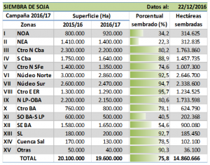 El Panorama Agrícola Semanal además explicó que “puntualmente en la región Sudeste de Buenos Aires la ventana de siembra de soja de segunda se extiende hasta el 10 de enero y gran parte de esta superficie podría quedar afuera de la rotación si no se registran lluvias durante las próximas semanas que reviertan la actual condición de déficit hídrico. En este contexto, la siembra a escala nacional cubrió un 75,8 % del área proyectada en 19.600.000 hectáreas, marcando un progreso intersemanal de 9,3 puntos porcentuales y manteniendo un retraso interanual de 6 puntos. En números absolutos ya se han sembrado poco menos de 15 MHa y un 35 % del área pendiente se ubica en las regiones NOA y NEA, que ya transitan plena ventana de siembra y la buena oferta hídrica de los cuadros permitió avanzar rápidamente con la incorporación de lotes durante los días previos”.