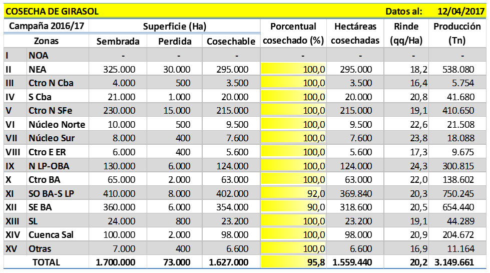 “La cosecha de girasol registró un avance intersemanal de sólo 3,8 puntos porcentuales, como consecuencia de la falta de piso producto de las precipitaciones acumuladas durante el fin de semana en gran parte de Buenos Aires y La Pampa. De todas maneras, en los días previos al frente de tormenta, se logró finalizar con la recolección de la oleaginosa en las regiones del Norte de La Pampa-Oeste de Buenos Aires y Centro de Buenos Aires, donde restaban los últimos lotes en madurez fisiológica. Bajo este escenario, el progreso nacional de cosecha alcanzó el 95,8 % de la superficie apta, manteniendo un retraso en comparación a la campaña previa de 4,2 puntos porcentuales. A su vez, el rinde medio nacional ascendió a 20,2 qq/Ha y permitió acumular un volumen parcial superior a las 3,1 MHas. En caso de registrarse una mejora en las condiciones climáticas durante los próximos días, la cosecha de girasol podría darse por finalizada, y de esta manera, alcanzar la proyección de producción de 3.300.000 toneladas, cifra que reflejaría un incremento interanual del 32 % (Producción 2015/16: 2,5 MTn)”, indicó la Bolsa de Cereales de Buenos Aires.