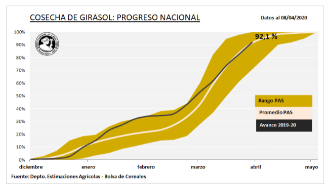 El Panorama Agrícola Semanal explicó además que “desde nuestro informe previo, la cosecha ha progresado a buen ritmo sobre el área remanente de girasol. A la fecha, se ha superado el 90 % de cosecha y la superficie aún en pie se distribuye entre Buenos Aires y La Pampa. En las regiones Sudeste de Buenos Aires y el Sudoeste de Buenos Aires-Sur de La Pampa, los progresos intersemanales fueron de 19,2 y 16 puntos porcentuales respectivamente”.