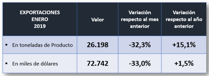 “En enero de 2019 las exportaciones de productos lácteos fueron de 26.198 toneladas por un valor de US$ 72,7 millones, lo que representa una disminución del 32,2% y 33,0% respectivamente en comparación con el mes anterior y un incremento de 15,1% en volumen comparado con enero 2018 y +1,5% en valor para igual mes del año pasado. Se dio una importante caída en el volumen del Resto de Productos y en el valor unitario promedio de las exportaciones (-11,9%). Cabe acotar que en la comparación intermensual lo estamos haciendo con diciembre de 2018 que fue el más alto de los últimos 5 años para dicho mes”, señaló el Observatorio de la Cadena Láctea Argentina (OCLA).