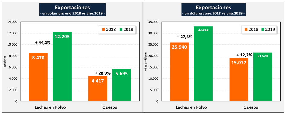 Los dos principales rubros de exportación, las leches en polvo y los quesos, tuvieron en enero de 2019 la evolución que muestran los gráficos comparados con igual mes del año anterior
