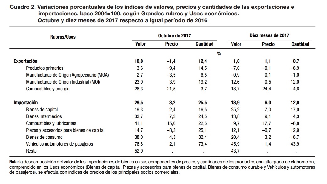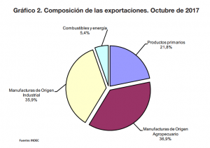 “En octubre de 2017, las exportaciones alcanzaron 5.241 millones de dólares y las importaciones 6.196 millones de dólares. El déficit en la balanza comercial fue de 955 millones de dólares”, explica el informe.