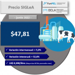 Este martes, se publicó el valor del litro de leche en el SIGLeA, correspondiente al mes de junio, con una mejora sensible del precio del 5%, igualando el incremento del mayo. En valores absolutos, varió de 45,52 pesos a 47,81 y significa una variación interanual del 52,6%, de acuerdo a la información que publica el Observatorio de la Cadena Láctea (OCLA)