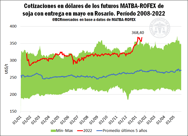 Solo para poner un ejemplo, la semana pasada en el mercado de futuros del Matba-Rofex de la argentina, los precios de estos dos commodities evidenciaron su mayor precio de la historia. Para el maíz entrega en abril, el precio fue de 225,50 u$s/tn, mientras que la soja entrega en mayo alcanzó los 368,40 u$s/tn.