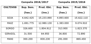 La mejor campaña de la historia en Córdoba. El total de la producción obtenida para la campaña 2016/2017 es de 35.382.987 toneladas. Esto significa casi 6 millones de toneladas más que la campaña inmediata anterior. Si bien quedan algunos pocos lotes por relevar en maní, maíz y sorgo, estos números prácticamente no tendrán variaciones.