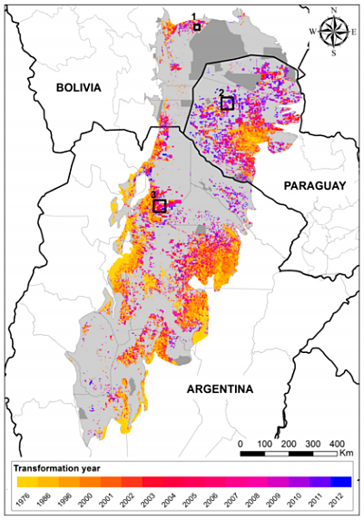 Además, la investigadora utilizó las imágenes para caracterizar la fragmentación del bosque: “La forma en que se expanden los desmontes y el tamaño predominante de los lotes brinda información acerca de los actores que transforman el territorio. En el Gran Chaco argentino y paraguayo dominan los grandes lotes, ya que los agricultores mecanizados y conectados con los mercados externos son el motor del cambio en el uso del suelo”.