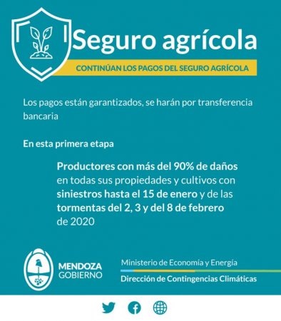 El Ministerio de Economía y Energía de Mendoza comenzó con el cronograma de pagos del Seguro Agrícola. Se trata de liquidaciones anticipadas para productores adheridos que tuvieron pérdidas, por granizo y/o heladas, superiores al 90% entre octubre de 2019 y febrero de 2020.