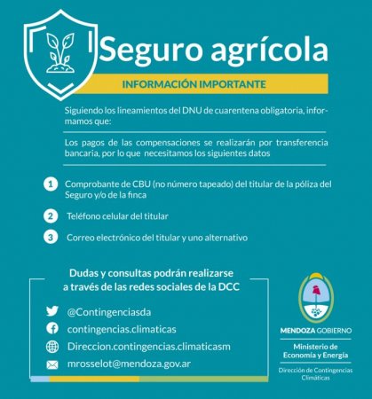 Por ese motivo, los productores con daños mayores al 90% en todas sus propiedades y en todos los cultivos que no hayan percibido la indemnización deberán enviar un correo electrónico con la constancia de su CBU, a las siguientes direcciones: [email protected] y [email protected], con copia a [email protected].