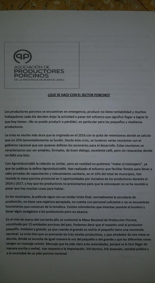 La Asociación de Productores Porcinos de la provincia de Buenos Aires emitió un comunicado en el que manifestó la “terrible situación que atraviesa el sector y la falta de respuestas” de los gobiernos de todos los ámbitos.