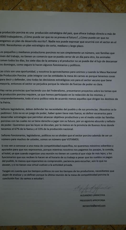 “Tengan en cuenta que los tiempos políticos no son los tiempos de los productores: necesitamos que dejen de de analizar y se definan porque la última reunión de la Mesa Porcina la conclusión fue ‘lo vamos a estudiar'”, finalizaron.