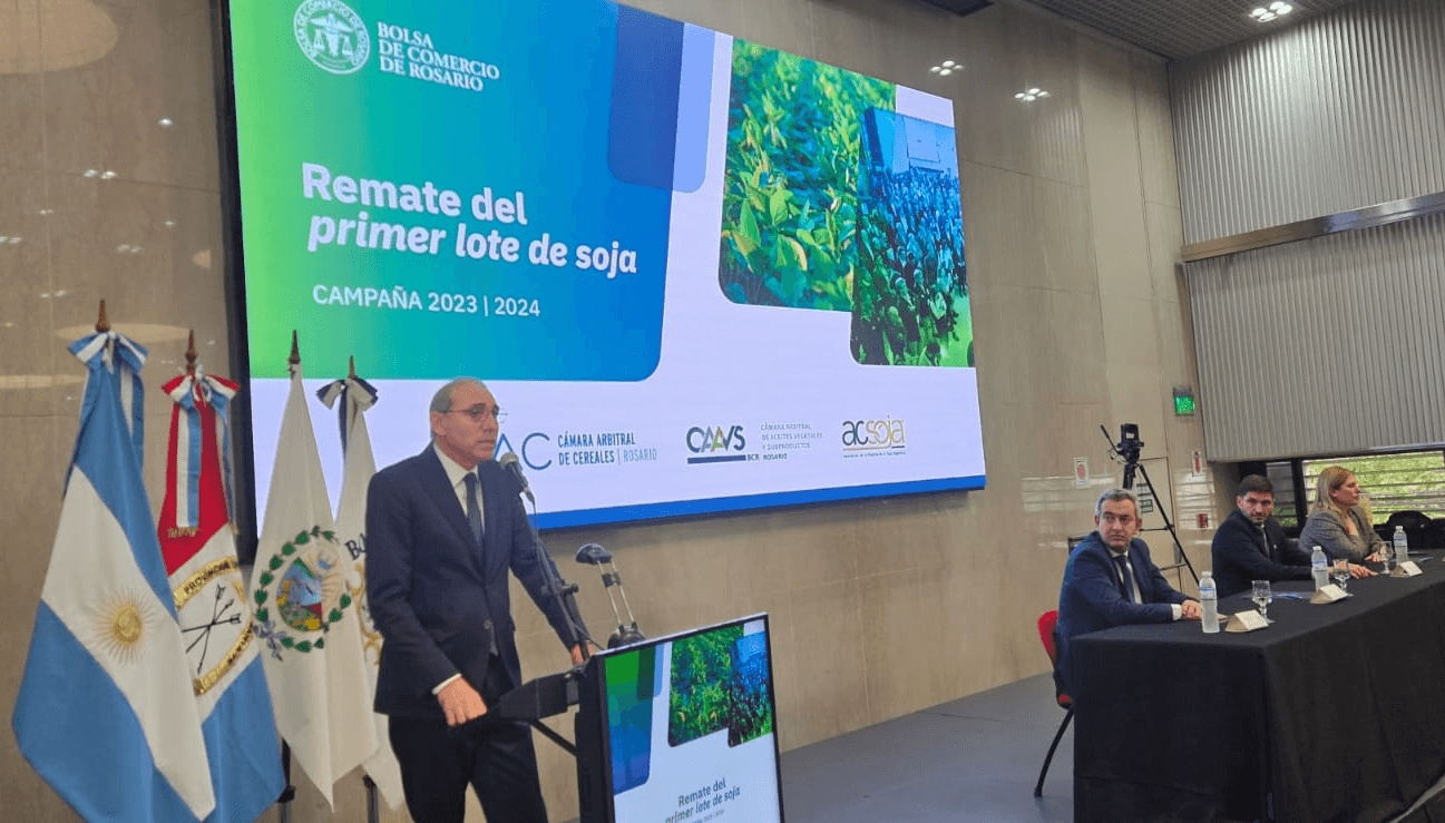 “No puede ser que la producción salga del campo en caminos de tierra y también llegue así a los puertos”, dijo Simioni al encabezar el acto por el Remate del primer lote de soja.