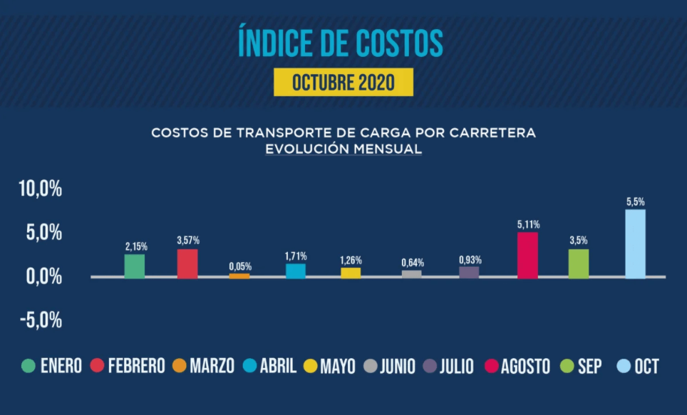 La Federación Argentina de Entidades Empresarias del Autotransporte de Cargas (FADEEAC) informó que el mes de octubre registró un alza para los costos del transporte terrestre de 5,52% marcando una variación acumulada en los últimos doce meses del 34,4%, y teniendo en cuenta que 2019 cerró con un total del 47%.