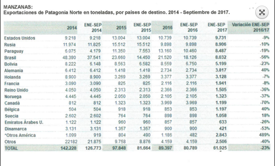 Un informe del Mensuario Estadístico elaborado por el Centro Regional Patagonia Norte del Servicio Nacional de Sanidad y Calidad Agroalimentaria (Senasa) señaló que en los primeros nueve meses del año las exportaciones de peras y manzanas de esa zona cayeron 17,44% interanual al alcanzar 299.560 toneladas frente a las 361.644 toneladas de igual período de 2016.