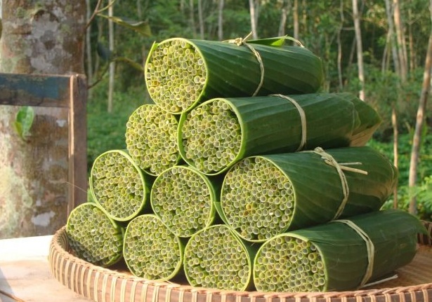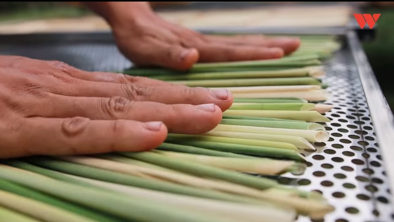 Remarcan que la empresa tiene por norma aplicar otra ronda de lavado. Después del secado, se juntan las pajitas y se envuelven en hojas de plátano.