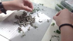 -Alimentación: se requiere realizar una cosecha diaria de hojas de morera y se deberá alimentar rigurosamente cuatro veces al día, siempre respetando el mismo horario ya que las larvas pueden sufrir un estrés de alimentación. Los horarios recomendados son los siguientes: 8, 12, 15 y 18 horas.