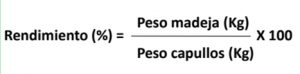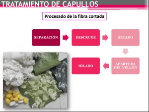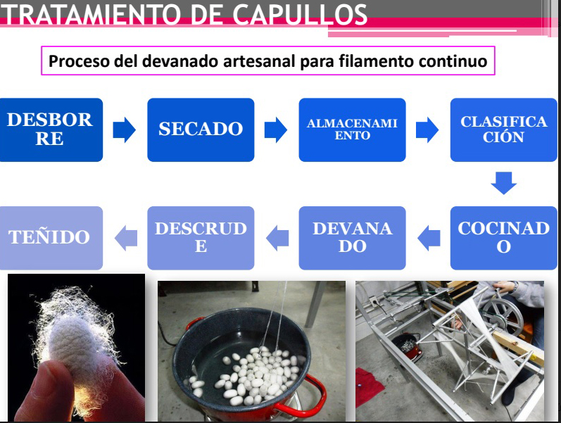 Como valor promedio, para sacar 1 Kg de madeja de seda cruda, se necesitan 7 Kg de capullos frescos, o 3 Kg de capullos secos