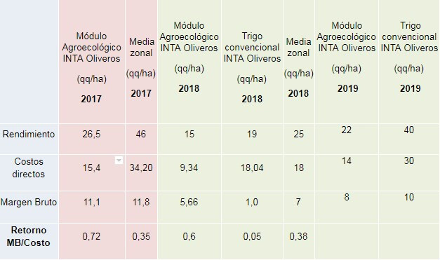 Una forma de mostrar esta relación es el cuadro comparativo adjunto en tres campañas sucesivas de trigo en la parcela agroecológica versus lo que sucede en el cultivo convencional.