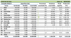 Según la Bolsa de Cereales de Buenos Aires, “a pesar de las lluvias que interrumpieron la recolección de lotes en diferentes sectores de la región agrícola, la cosecha de soja comienza a cobrar impulso. A la fecha se estima que el 5,9 % de la superficie apta a nivel nacional ya fue recolectada, promediando un rinde de 31,9 qq/Ha y permitiendo acumular un volumen parcial superior a las 3,5 millones de toneladas. La recolección concentró su actividad en la región Núcleo Norte, con un rinde promedio regional de 39,1 qq/Ha, mientras que el Centro-Norte de Santa Fe, el Centro-Norte y Sur de Córdoba y el Núcleo Sur también registraron cosecha, aunque con avances dispares”.