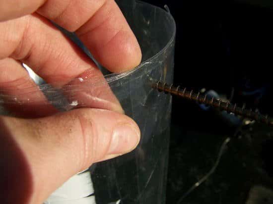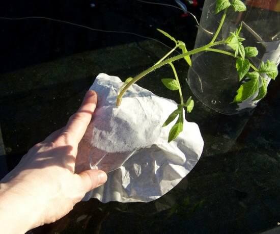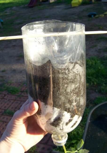 - Sacar la planta por el cuello de la botella: con cuidado, pasar la planta de tomate a través del cuello de la botella, asegurándose que el filtro quede pegado al plástico. También se le puede hacer agujeros en la parte del cuello de la botella para asegurarse un buen drenado, pero es opcional dependiendo de que tanto llueva en tu zona.