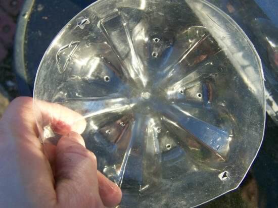 - Perforar la parte inferior (previamente cortada) de la botella: realizar de 10 a 15 agujeros para que la propia botella actúe como dispensador de agua y riegue la planta.