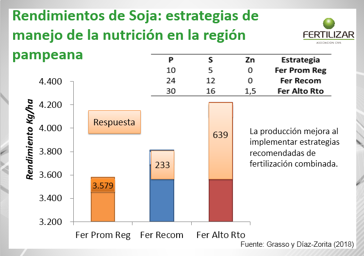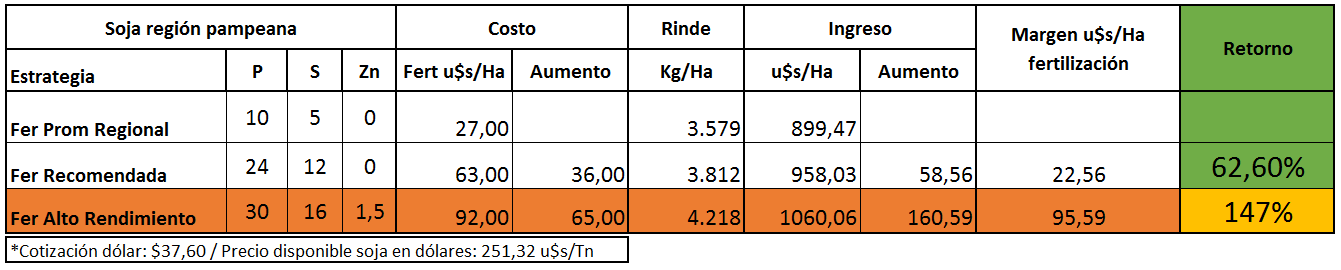 El primero en caer fue el de la soja=yuyo que no responde a la fertilización. Un ensayo de la Asociación realizado en la región pampeana demostró una gran respuesta a un esquema productivo de alta nutrición (30P, 16S, 1,5Zn), en el que se consiguió elevar los rendimientos de la oleaginosa en 639 Kg/Ha, lo que al precio disponible de hoy (9.450 $/Tn) y la cotización del dólar a $37,60, significa 158 u$s/Ha.