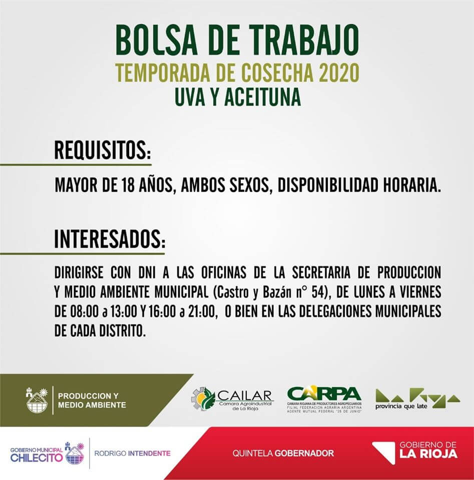 El gobierno municipal de Chilecito, La Rioja, abrió una bolsa de trabajo para reunir a 3.000 personas que levanten la cosecha de uva y aceitunas. Pero lo insólito fue que sólo 3 personas consultaron por los puestos y ninguna se inscribió.