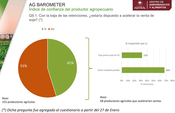Ahora bien, ¿qué harán los productores ahora que se rebajaron temporalmente? “Confirmada la baja de retenciones, el 45% de los productores considera acelerar las ventas/fijación de precios de soja. De ese porcentaje, el 68% lo hará con la soja que tiene en su poder de la campaña 2023/24, mientras que el otro 32% adelantará la venta fijación de precios de la campaña 2024/25”, detalla el informe.