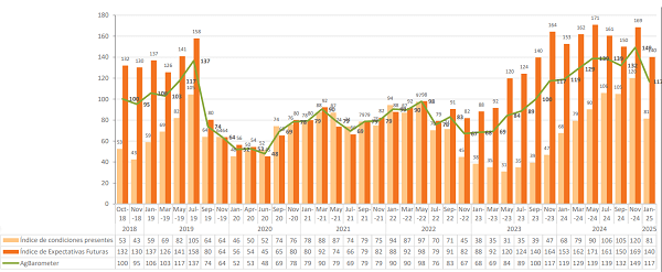 De todos modos, vale mencionar que a pesar de la significativa baja, el Ag Barometer aún se mantiene en terreno positivo, lejos de lo que sucedía en 2019: está en 117 puntos (43 más que en aquel entonces y por encima del 100), y la caída fue frente a noviembre, que con 149 puntos había alcanzado el máximo desde que se mide este indicador.