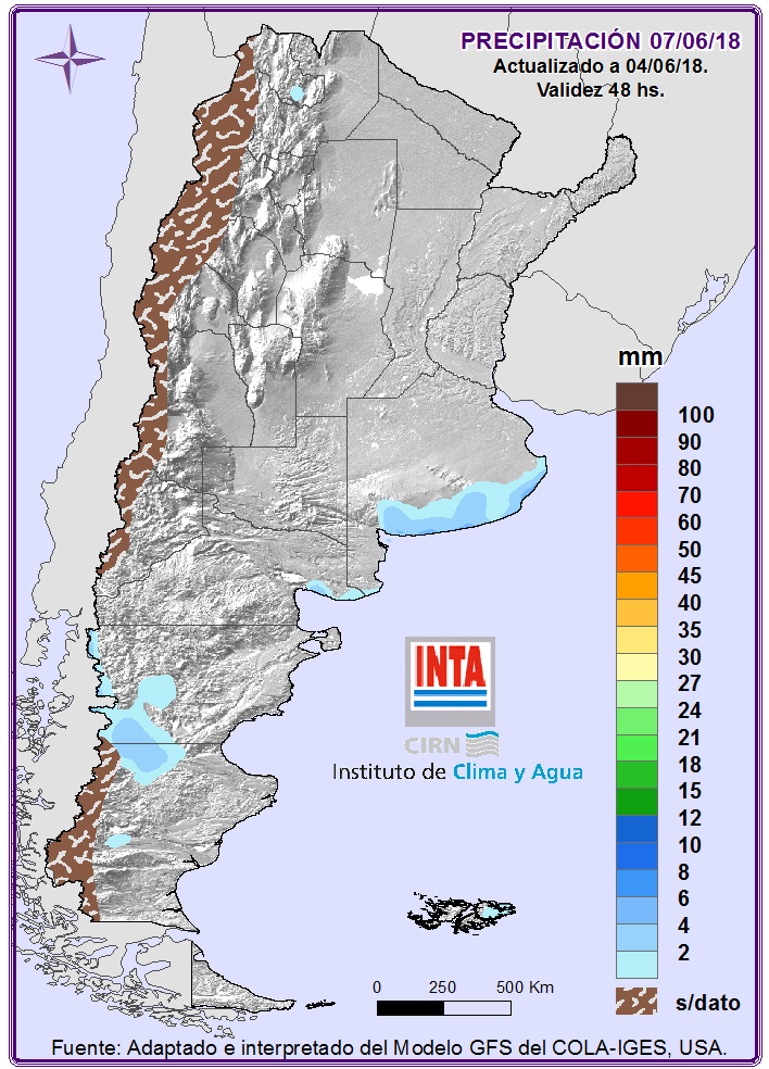 Para el martes 5 de junio: “Se prevé que otro pulso de aire frío que ingrese sobre el centro y norte del país, habría tiempo inestable sólo sobre Bs. As. (sur y este) y Misiones; podrían registrarse heladas dispersas sobre la reg. Pampeana, Cuyo y NOA, y temperaturas inferiores a 5°C en el NEA. En la Patagonia, se prevé aumento de la nubosidad con vientos del sector noroeste, hay probabilidad de lluvias y nevadas de variada intensidad sobre el centro y norte de la región”, informó el Instituto de Clima y Agua del INTA Castelar.