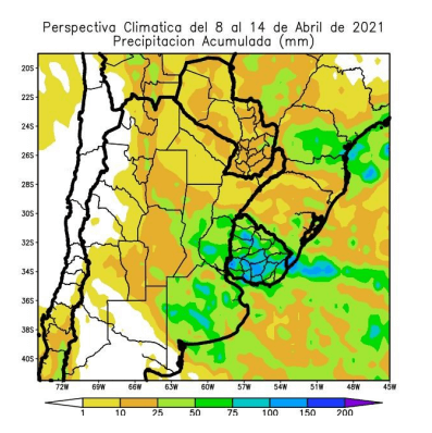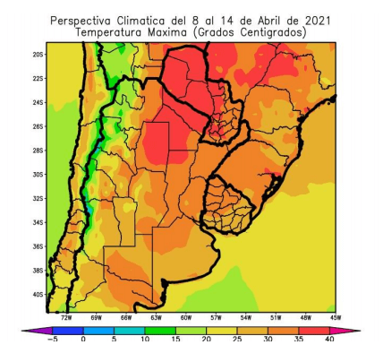 Según el Informe de Perspectivas Agroclimáticas de la Bolsa de Cereales de Buenos Aires desde el 8 de abril al 14 continuarán soplando los vientos del trópico manteniendo máximas elevadas en el norte del área agrícola, y comenzará el paso del frente de tormenta que producirá precipitaciones abundantes a muy abundantes sobre el sudeste y el centro-este del área agrícola.
