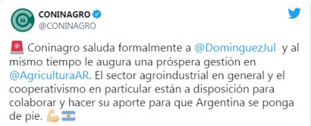 Por parte de Coninagro, publicaron un mensaje en su cuenta de Twitter en el que mostraron su apoyo a Domínguez y expresaron que “los cambios en el ministerio de Agricultura generan expectativas, ya que es una persona con experiencia en cargos públicos y en el sector”.