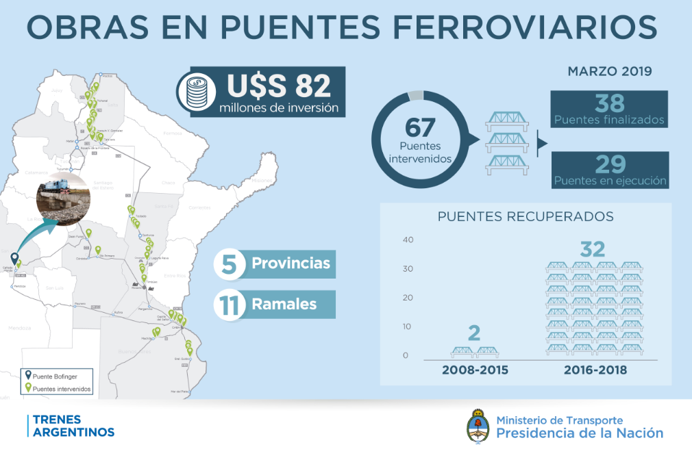 Según el registro de Trenes Argentinos Infraestructura, entre 2008 y 2015 se habían reparado o renovado tan solo dos puentes en todo el territorio nacional. De 2016 hasta 2019 se llevan renovados 38 puentes y hay 29 más en construcción o reparación. Además, en los próximos meses se licitarán más de 30 puentes, que permitirán potenciar las obras de renovación de vías de los trenes de carga.
