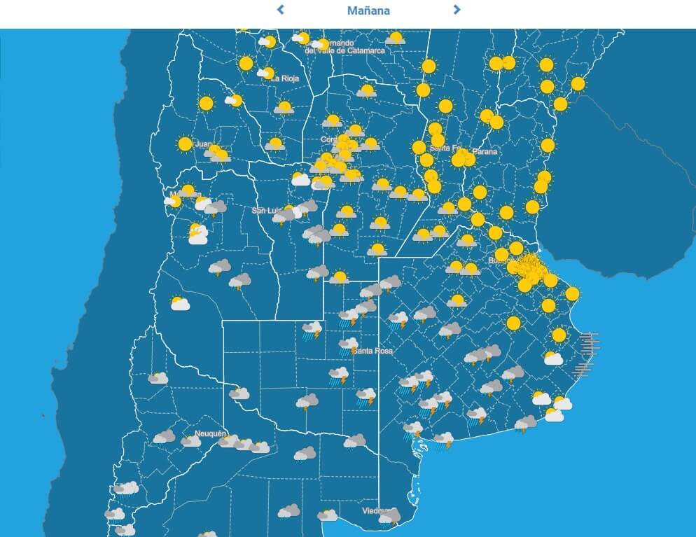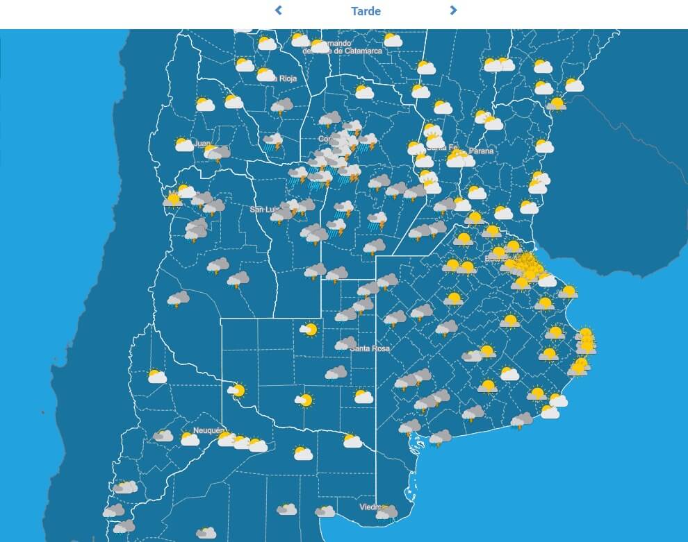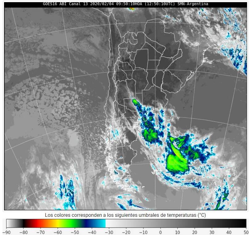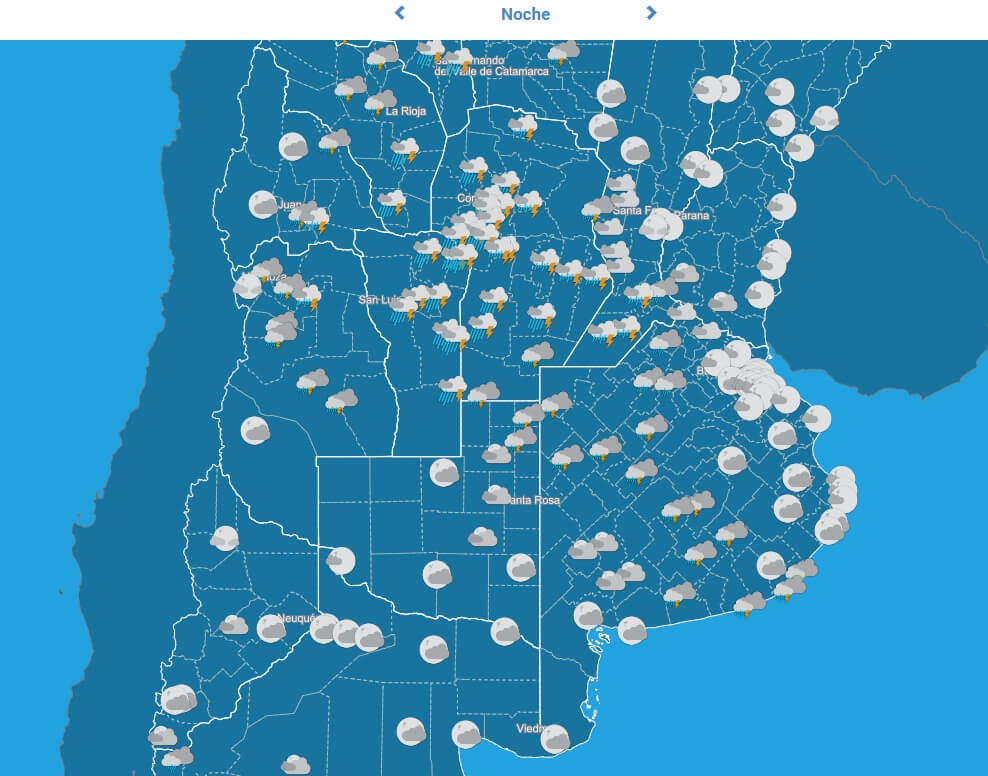 Sobre el área de cobertura se desarrollan tormentas aisladas. Algunas de estas tormentas pueden ser localmente fuertes, especialmente en el sudeste de Mendoza y en el noroeste de La Pampa, estando acompañadas de fuerte actividad eléctrica, ráfagas, abundante caída de agua en cortos períodos y caída de granizo.